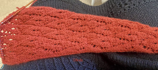 Schon am 9. Februar habe ich den Miloschal aus roter SuperCashmere von Sesia angeschlagen. Ich möchte eine verlängerte Variante stricken, habe jedoch vorgestern kurz vor Beginn der letzten Strickschrift bemerkt, dass ich doch die normale Länge arbeite. Deshalb habe ich bis zur Hälfte zurückgeribbelt und füge nun die zusätzlichen Mustersätze von Strickschrift 2 und 3 ein.